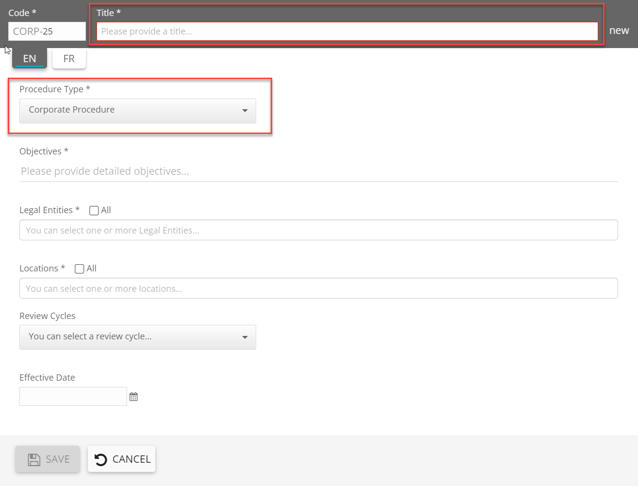 Click on 'operational procedures and guidelines' button from the 'create' menu. The operational procedure creation screen will appear: