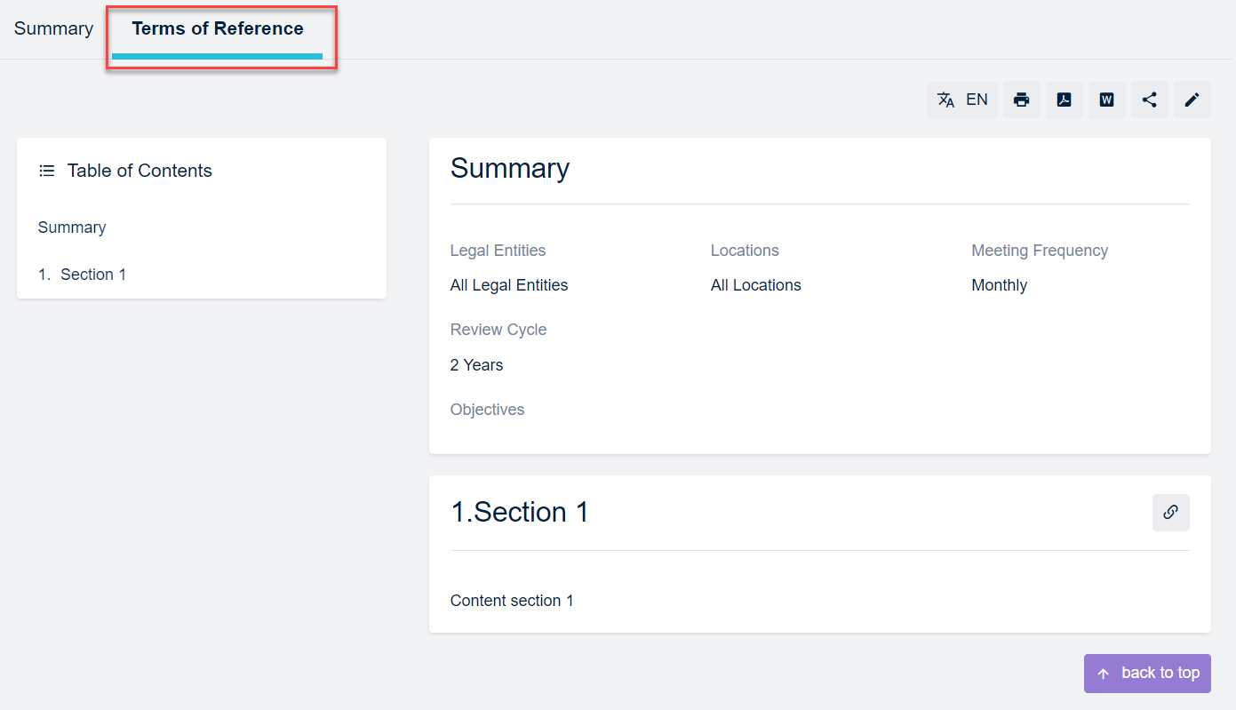 If you want to create a Terms of reference, you need to open the detailed view of a committee. From this view, you can click on the Terms of Reference section that is listed next to Summary. From this section, click on the green buttonto display the terms of reference creation screen. See examples below.
