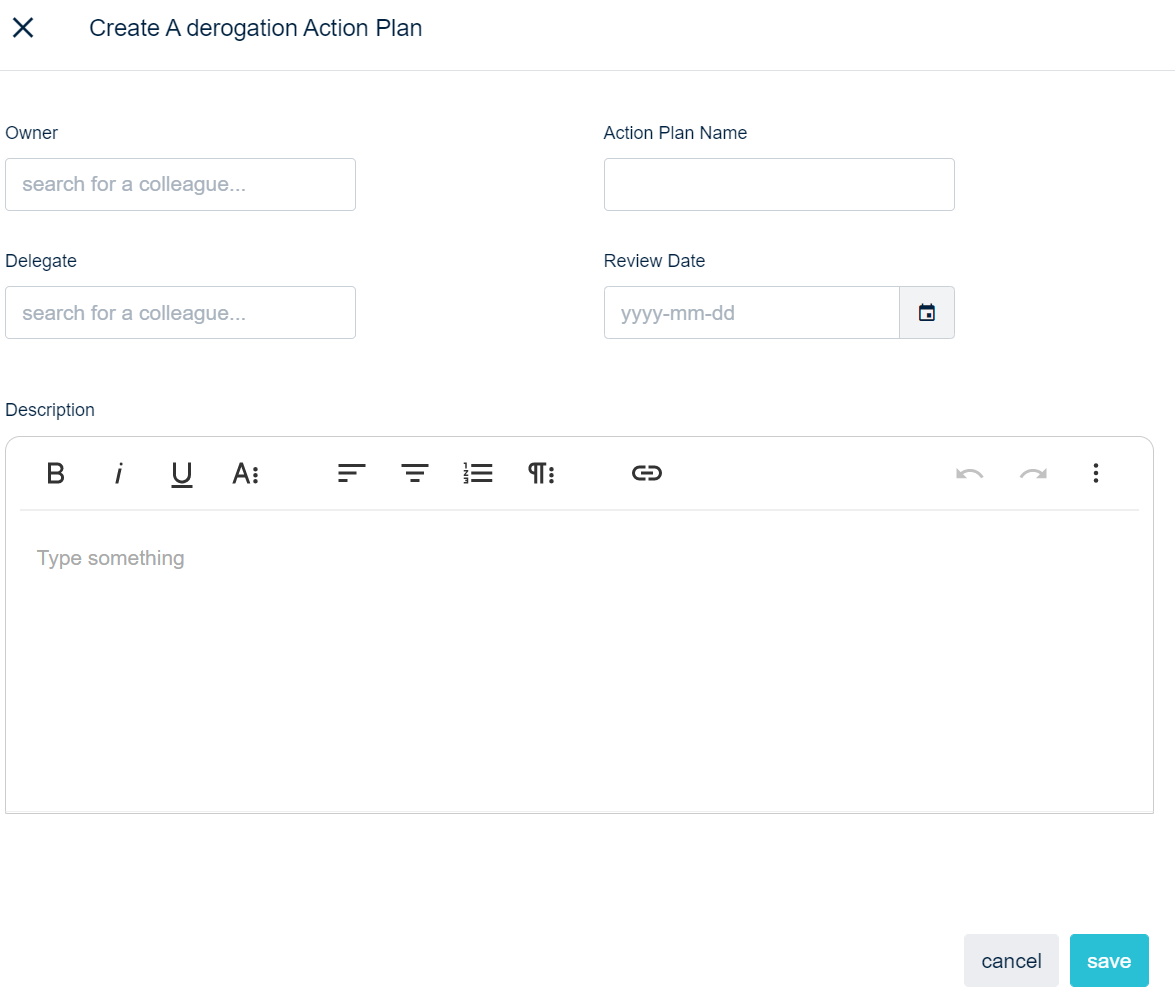 From the derogation analysis list, click on the menu of the derogation analysis that you want to associate a derogation action plan and click on the 'create derogation action plan' button. The derogation action plan creation screen will appear where you can: