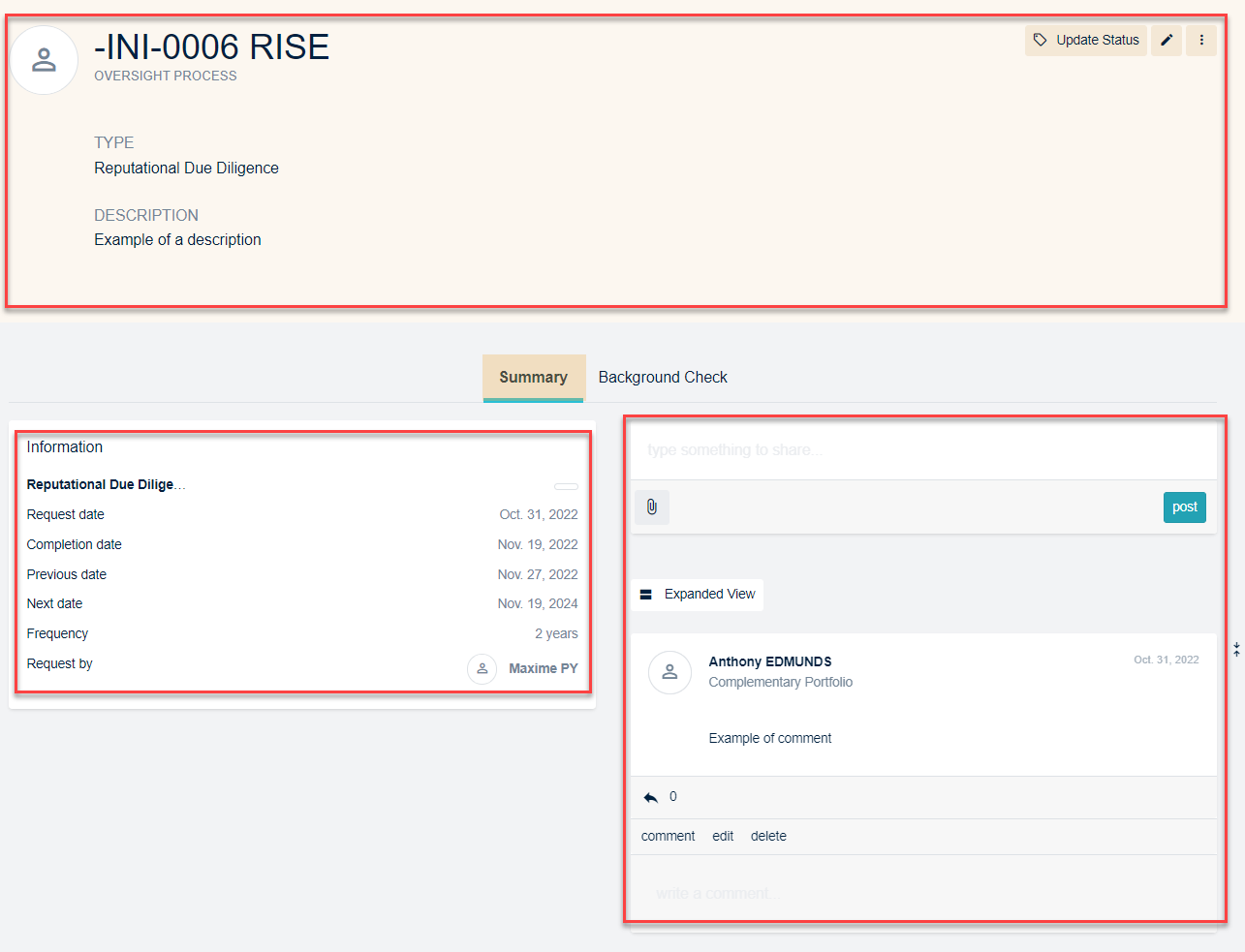 - Update the oversight process status by clicking on the 'update status' button. This update will appear on the comment field.