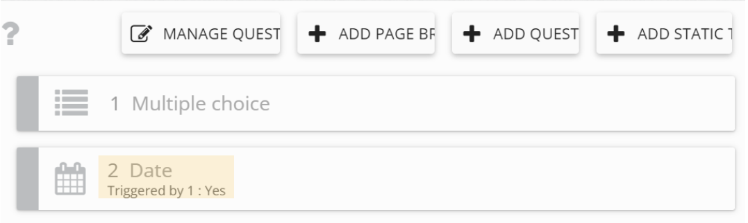 Click on the question you want to make conditional in order to open the question detailed view, then click on the 'add condition' button and select which question and modality will trigger your other question.