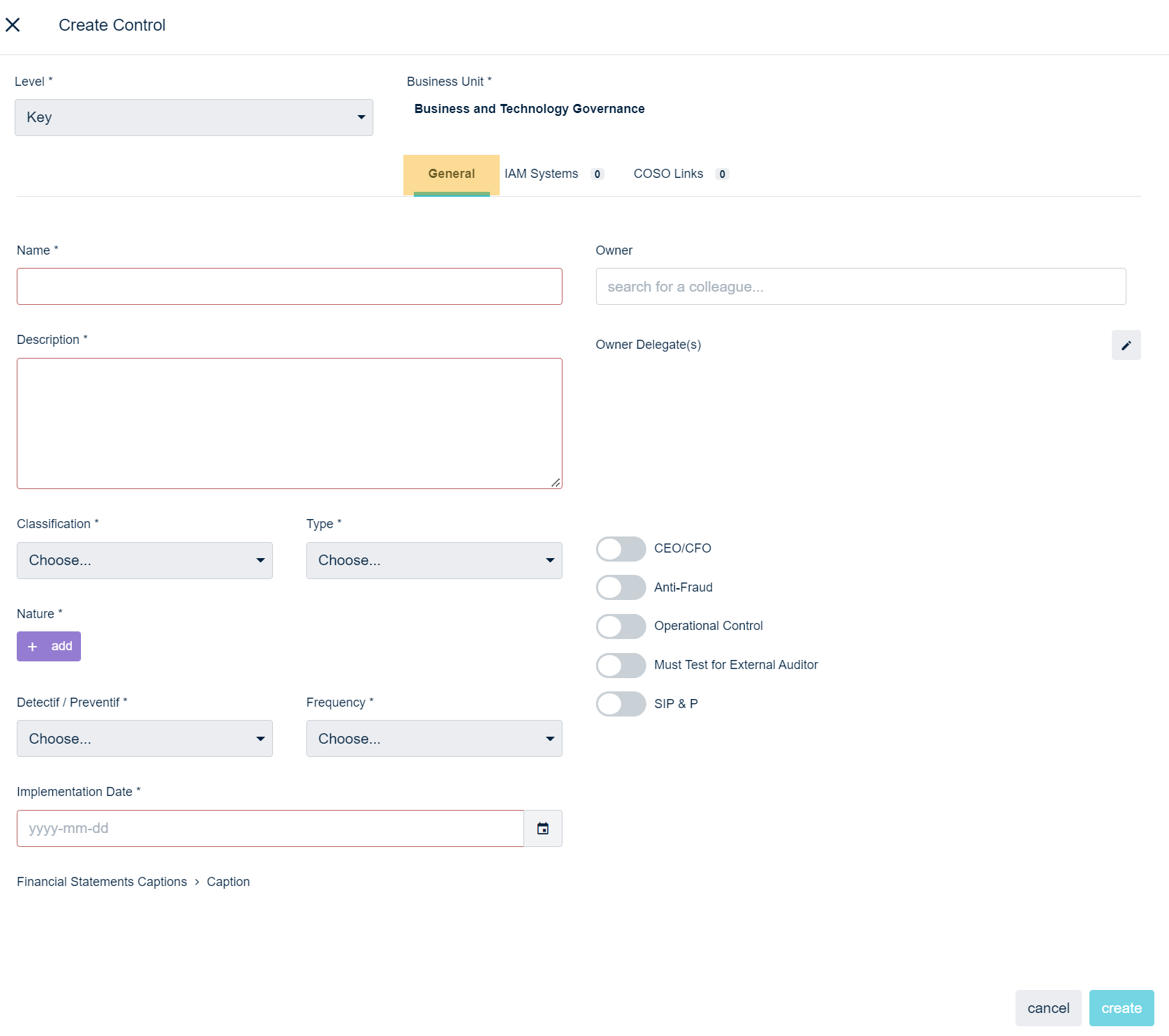 Please note that if you create a Key control, you can also add a control owner and owner delegate.